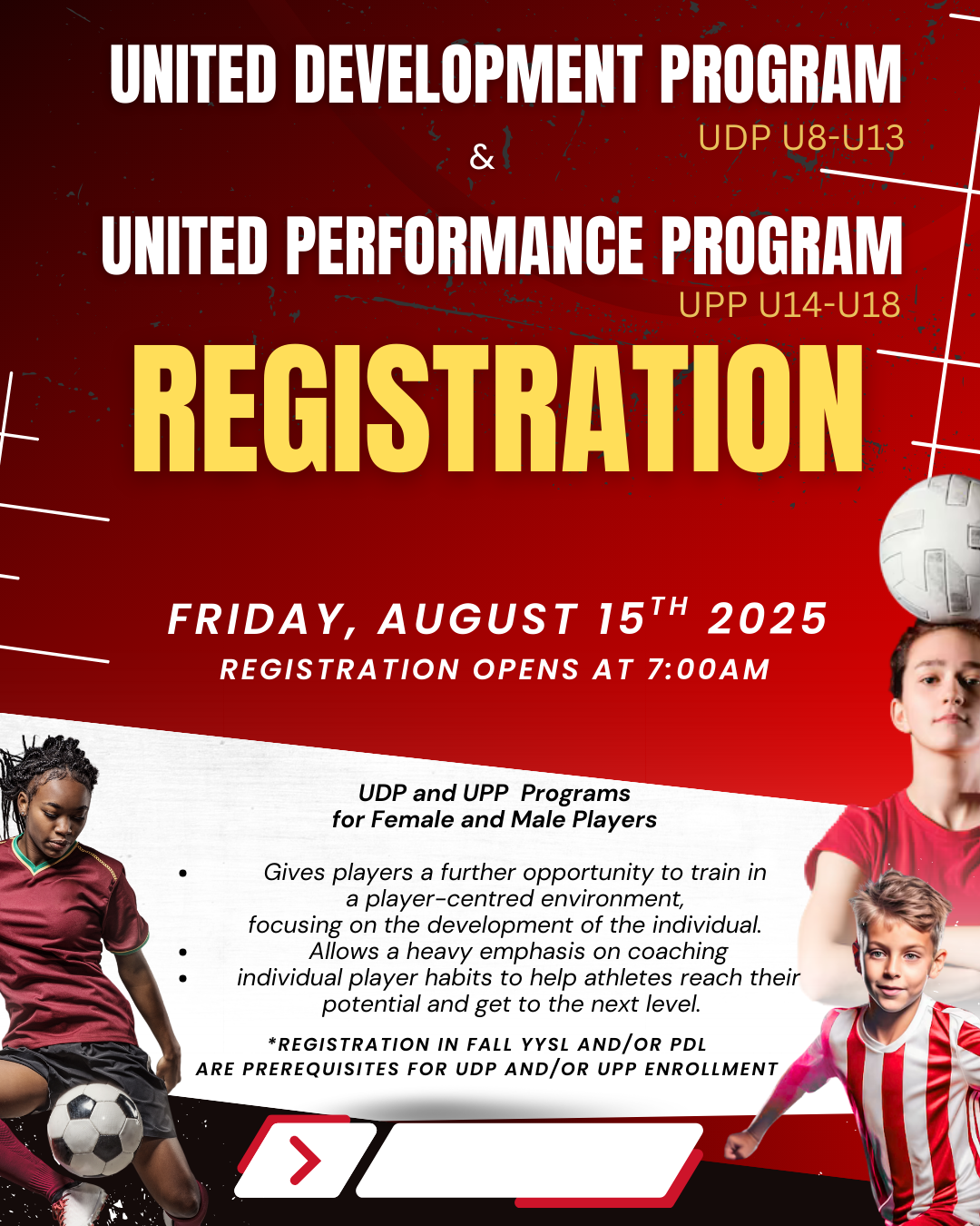 The United Performance Program is geared towards players , U14 (b.2012) to U18 (b.2008) , looking to advance their play and aspiring to advance to higher levels. While the program dovetails off our UDP program, the practices are led by a coach with an advanced coaching license. While there are a variety of skills and abilities participating in this program, players get placed in group with like-minded peers with competitive soccer goals. Ages: U14 to U18, players must be registered in PDL to participate in this program.Day: Monday evenings, Fall 2025Sept 8th, 15th, 22nd, 29th, October 6th, 13th, 20th, 27th(A 9th bonus session -indoors or outdoors- may be added , dependant on daylight and/or facility availability.)Location and Times(s):5/00pm to 6:3pm , 19 WingCOST: $150