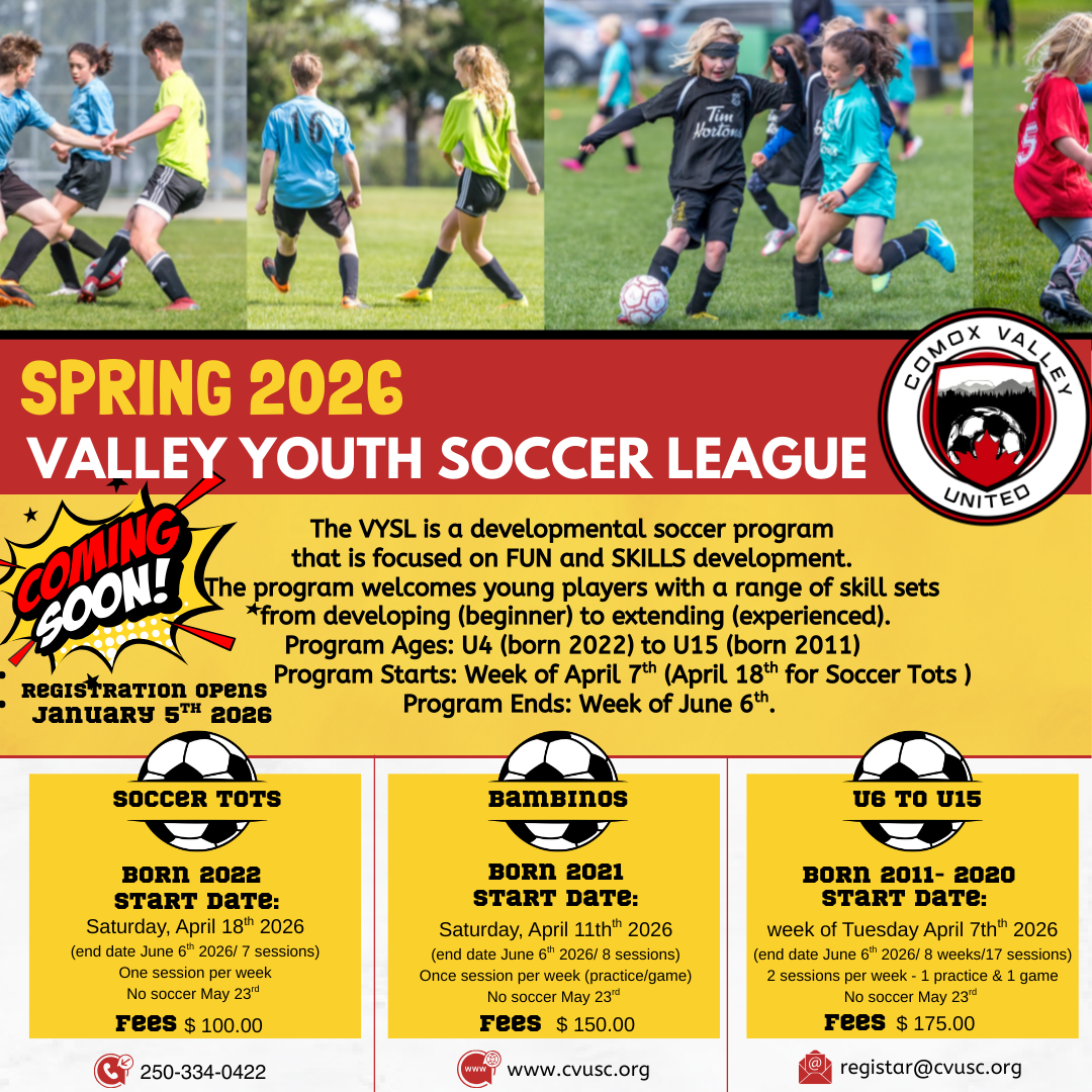 VYSL is a developmental soccer program, starting the first week of April (7th to the 11th) 2026, ending on June 6th.